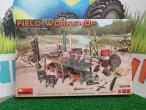 Atelier extérieur. Le kit contient des modèles de : bouteilles de gaz, échelles, table, seaux, chariot, enclume, poutres, support de cric et outils. Échelle 1/35ème mais convient parfaitement au 1/32ème. A monter et à peindre.