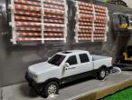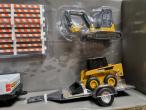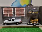 Pick-up JOHN DEERE avec remorque, chargeuse compacte, pelleteuse et accessoires.