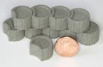 10 blocs soutènement/végétaux (gris). Les blocs peuvent être empilés et emboités. Diamètre environ 15.5 mm, hauteur environ 9.5 mm.