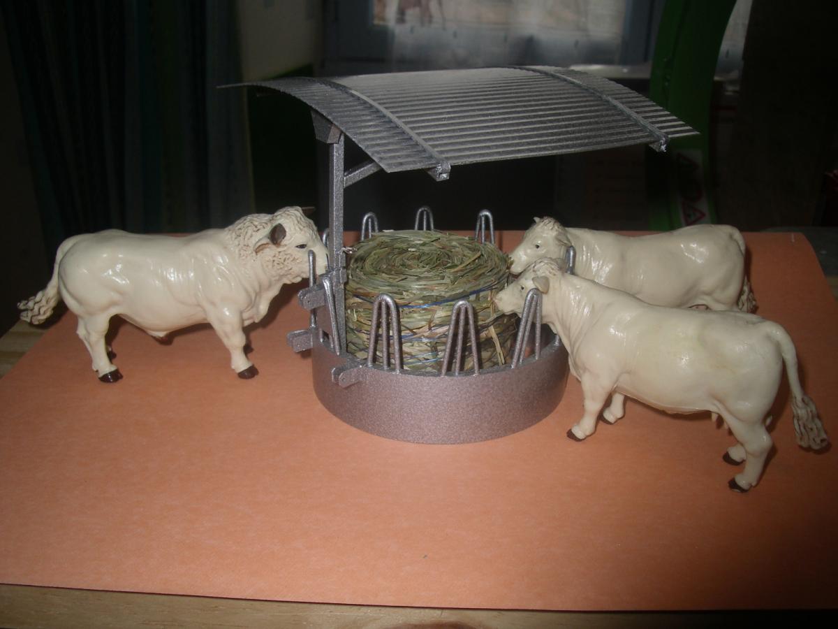 RÂTELIER A BOVINS CIRCULAIRE AVEC TOIT PIVOTANT ,LE TOIT ET EN MÉTAL LE RESTE EN PLASTIQUE. ATTELAGE 3 POINTS ,POSSIBLE D'UN ADAPTATEUR POUR AUTRE TRACTEUR ( non fourni dans la vente),PAS DE FOND. LES ANIMAUX ET LA BOTTE NE SON PAS A VENDRE. POUR VOIR MAIS AUTRES MODÈLES TAPEZ SUR MON PSEUDO