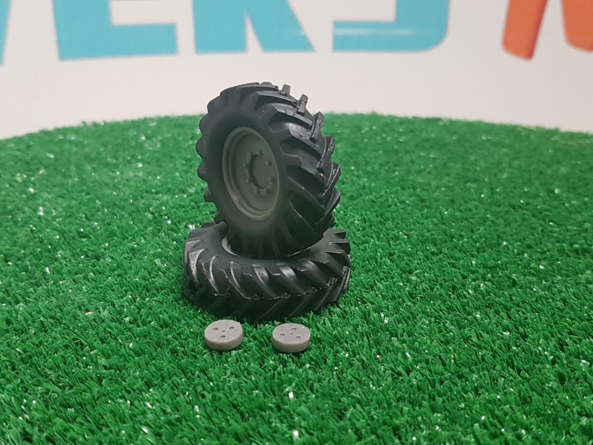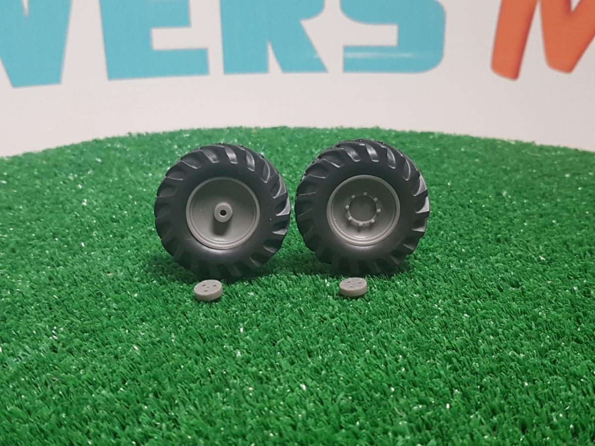 2 roues de train avant tracteur n°4 4 roues motrices. Résine et résine noire souple. Diamètre 38 mm. Largeur 11 mm.