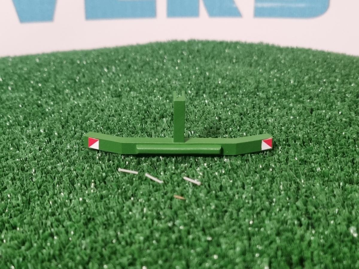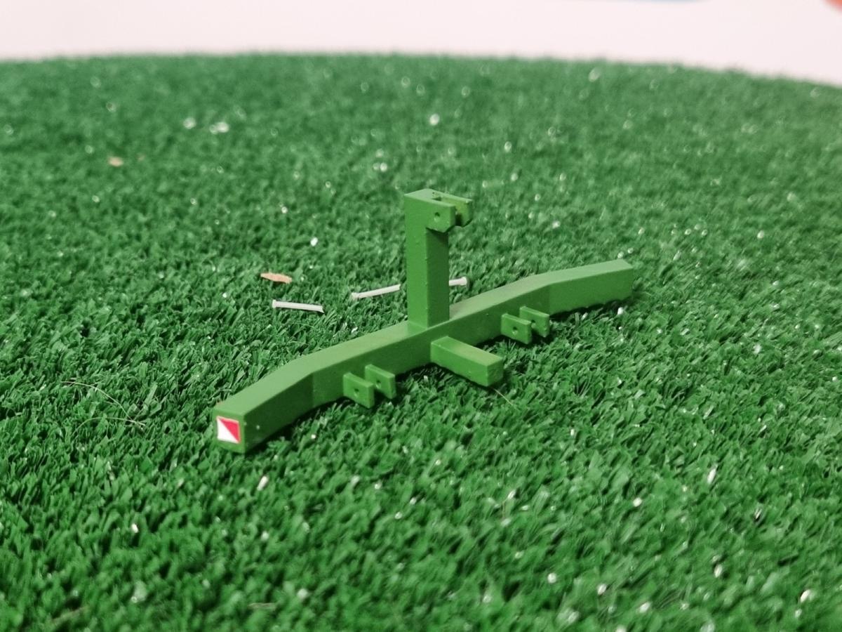 Pare-chocs tracteur (petit modèle) vert John Deere. Largeur totale 71mm. Livré peint en vert John Deere "récent" avec autocollants posés.