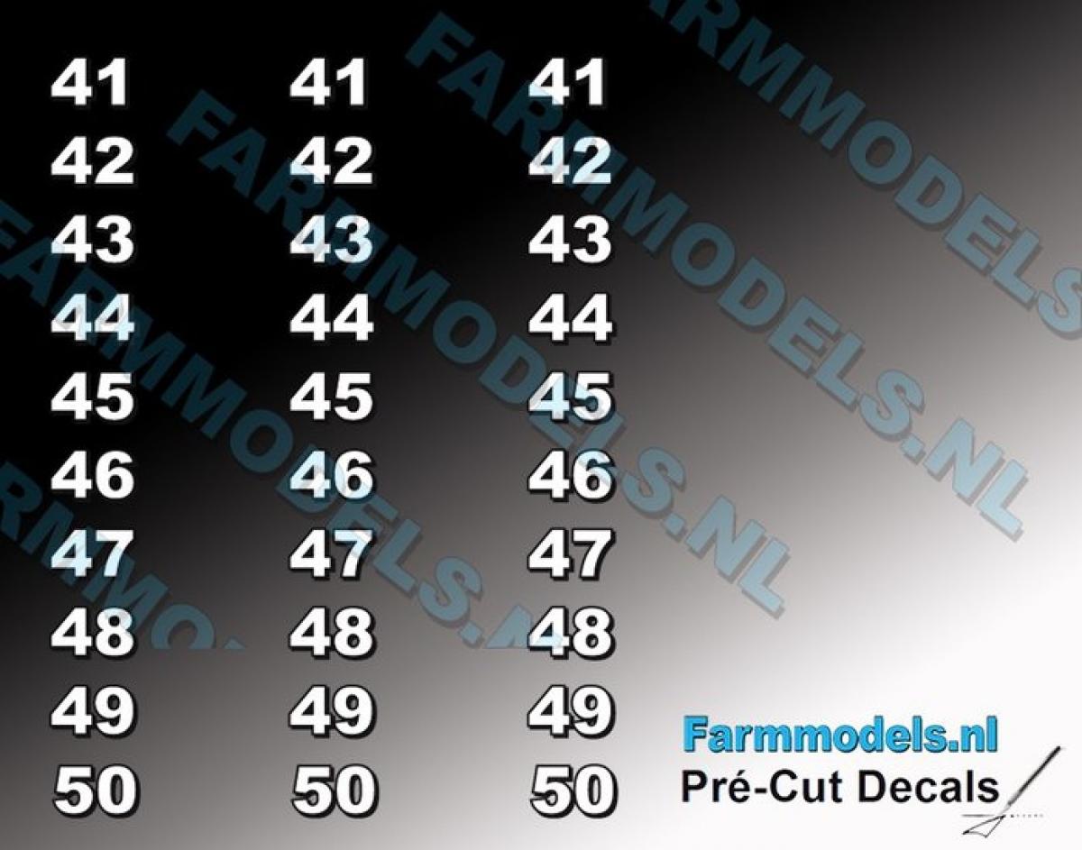 30 autocollants Nombres 41 à 50 blanc. Hauteur 5.6mm. Pré-coupés, décollez et collez comme un autocollant classique ou utilisez la méthode décalque.