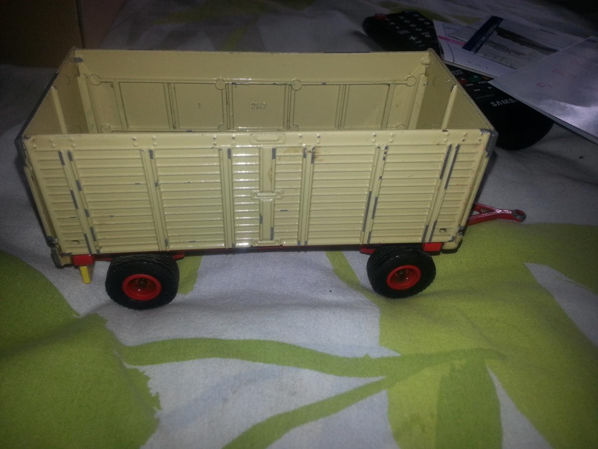 Bonjour alors voila je vend cette remorque/plateau du fabricant siku, il y a beaucoup d’éclats de peinture sur l'ensemble de la remorque est il manque une béquille pour que la benne soit a vider. N’hésiter pas a demander pour plus de photos ou autre.