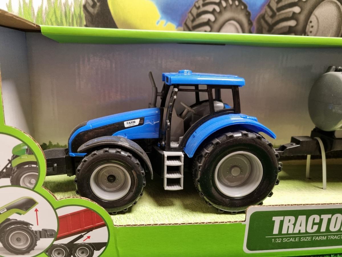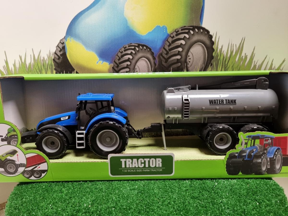 Jouet tracteur bleu avec tonne à eau.