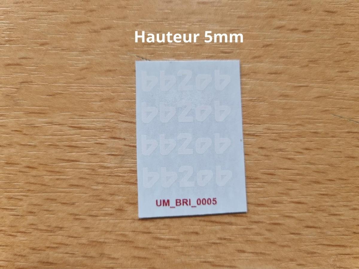 4 décalques BRIMONT BB20B blanc. Hauteur 5mm. Fond transparent. Décalque à l'eau. Couper au plus proche du motif et laissez tremper 10/15 secondes pour décoller le motif.