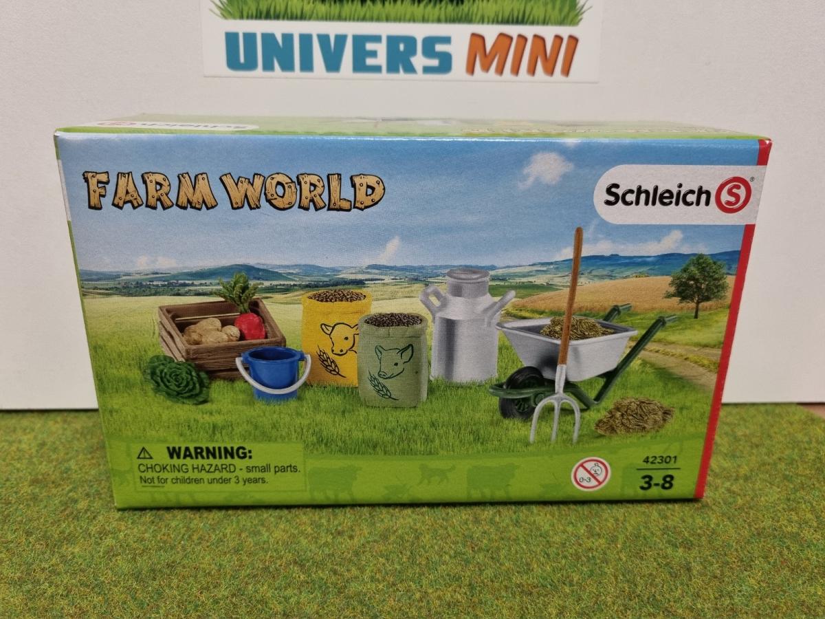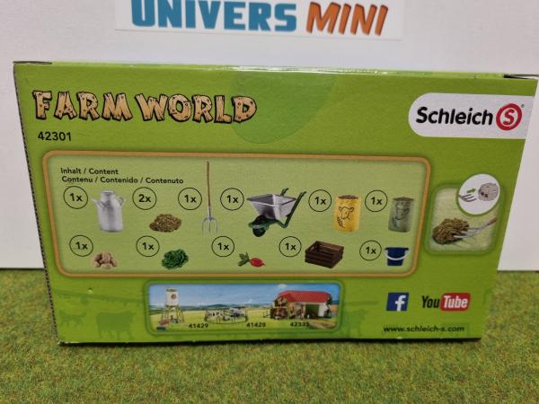 1 x sac de nourriture jaune, 1 x sac de nourriture vert, 1 x caisse de nourriture, 1 x salade, 1 x betterave fourragère, 1 x pomme de terre, 1 x bidon à lait, 1 x seau bleu, 1 x brouette, 1 x fourche, 2 x foin à prendre à la fourche