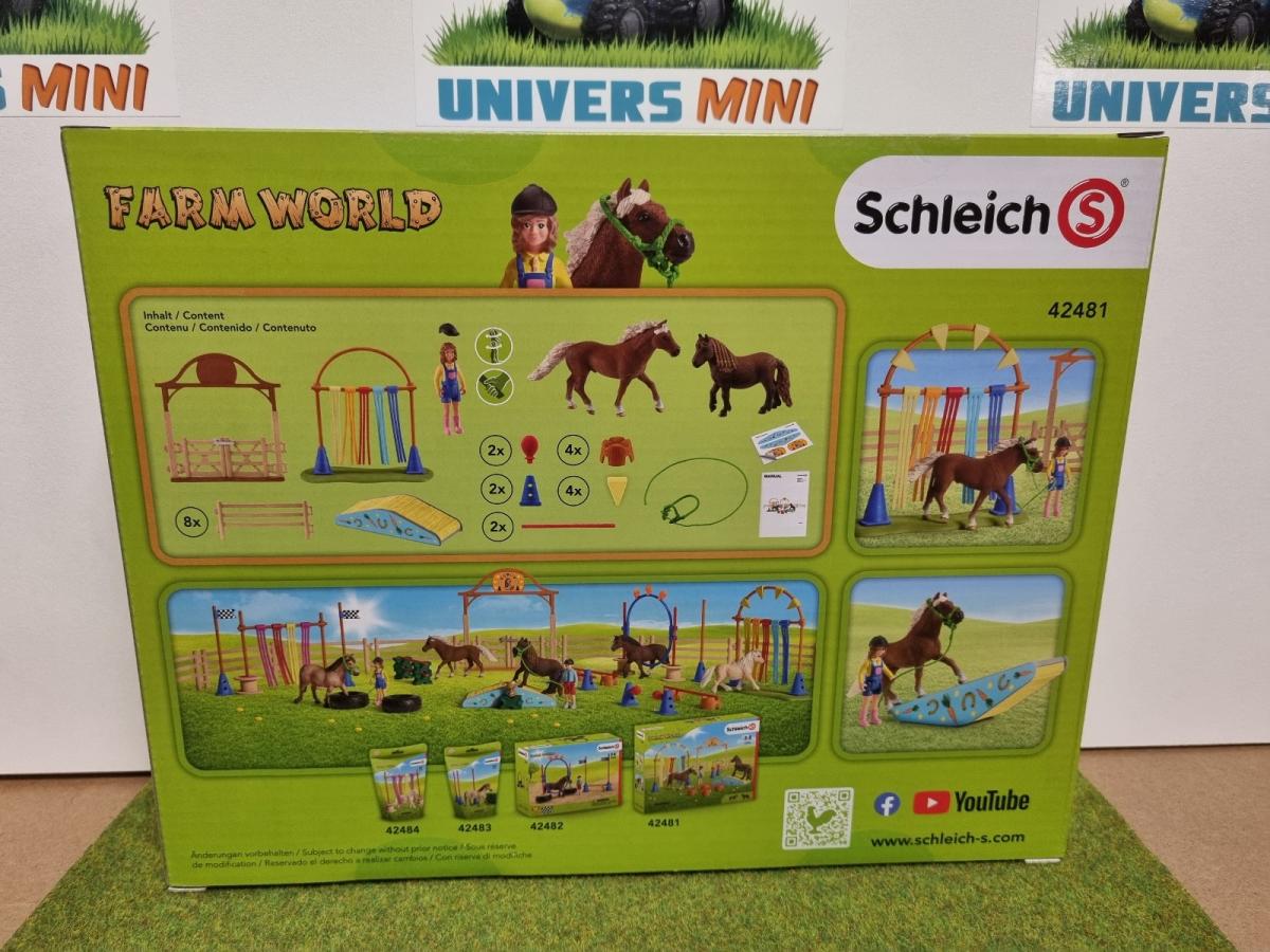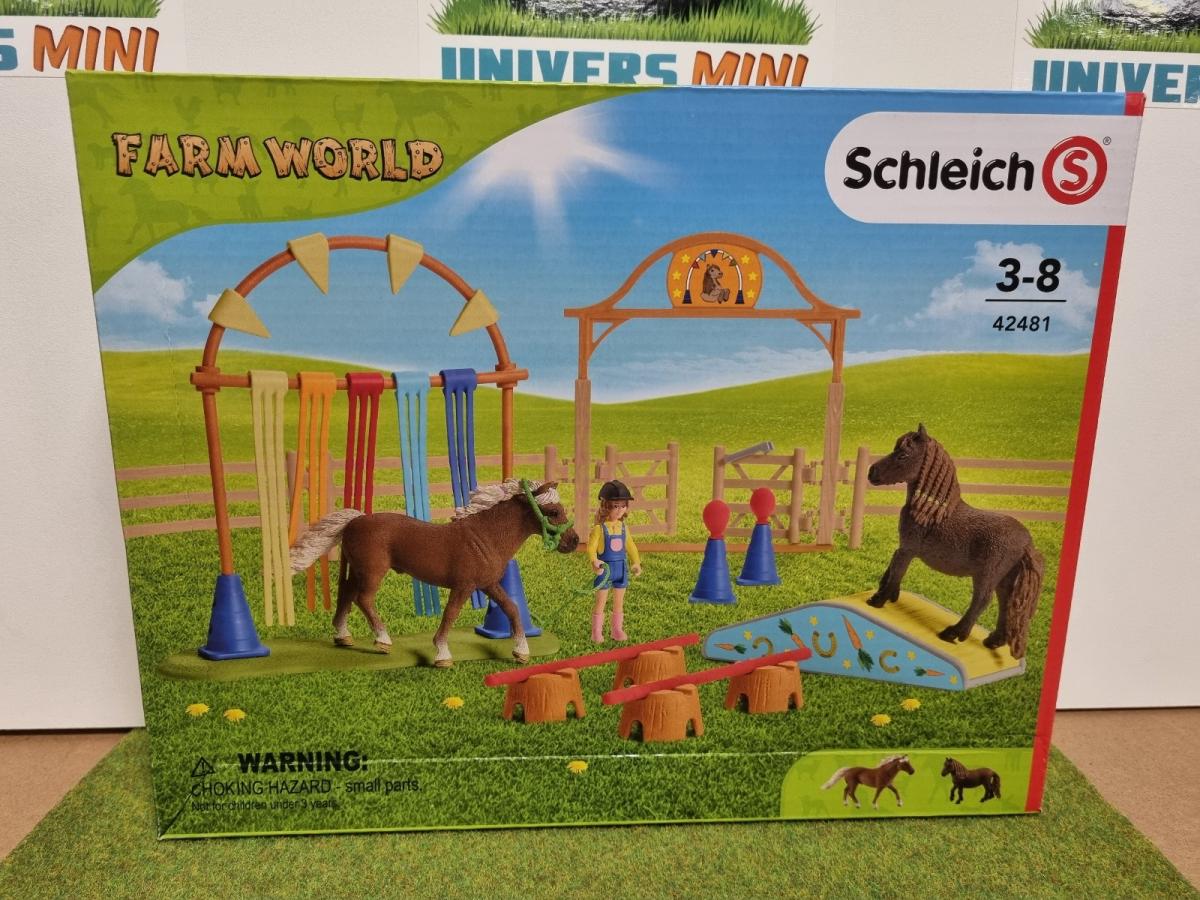 1x poney classique, 1x poney shetland, 1x jeune fille, 1x bombe, 1x harnais, 1x longe, 1x porte d’accès, 8x paddock, 1x bascule, 4x cône, 4x obstacle souche d’arbre, 2x barre, 2x ballon, 1x socle, 1x porte voûtée, 4x fanion, 1x barre transversale, 5x rideau, 1x feuille d’autocollants