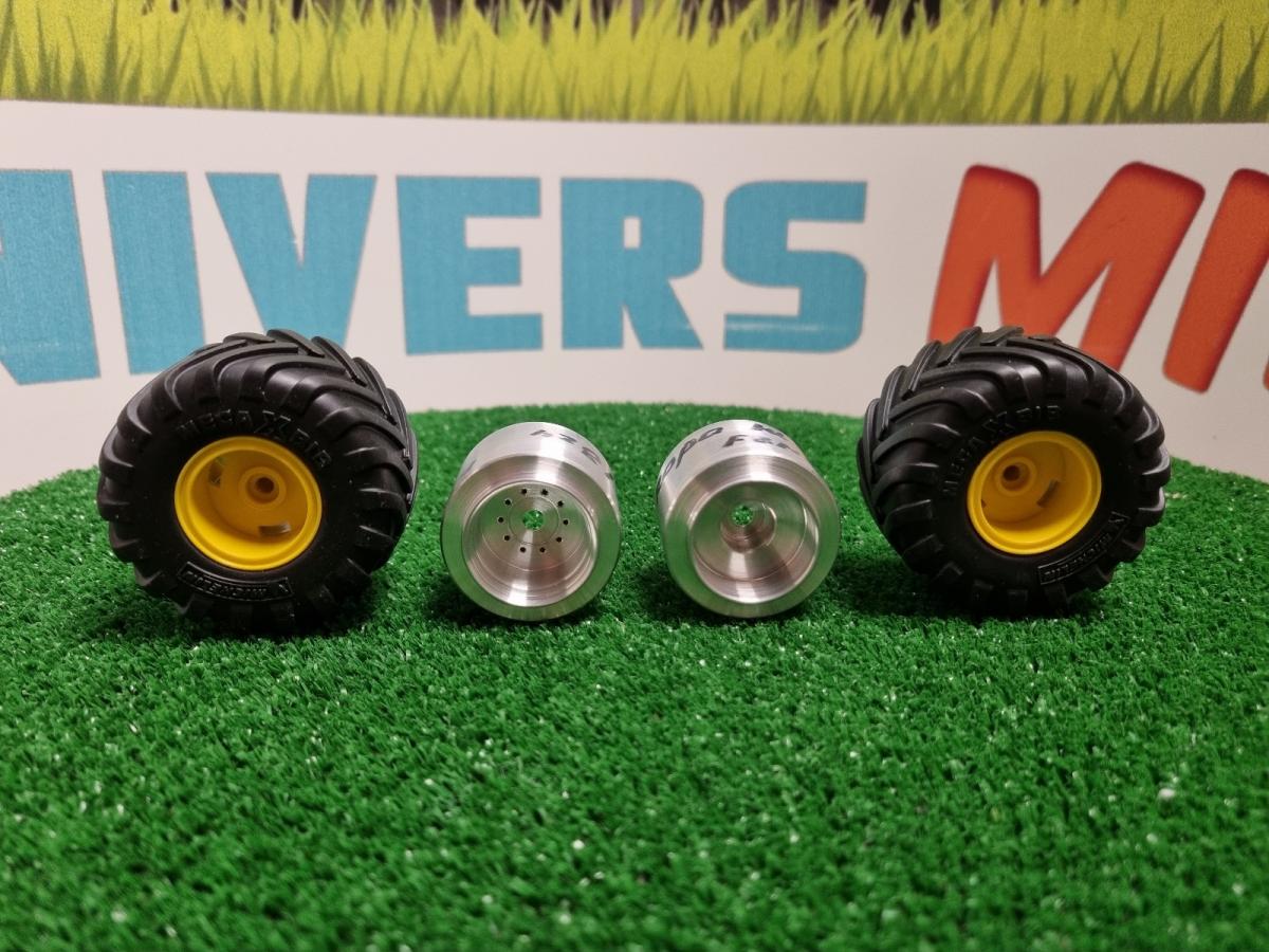 2 jantes aluminium avant avec 2 pneus Michelin Mega XBIB pour tracteur FENDT 824/ 926 Gen I du fabricant Weise-Toys. Diamètre 54mm. Largeur 32mm.