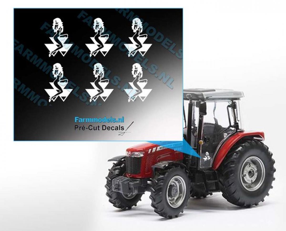 6 autocollants logo Massey-Ferguson avec femme blanc. 5.3x7.5mm. Pré-coupés, décollez et collez comme un autocollant classique ou utilisez la méthode décalque.