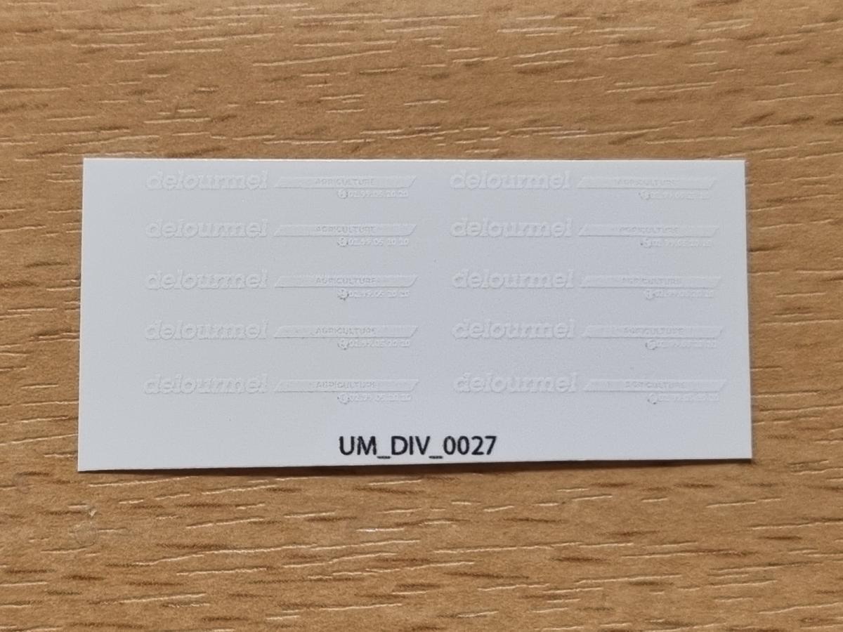10 autocollants DELOURMEL blanc. 2.5x22mm. Pré-coupés, décollez et collez comme un autocollant classique ou utilisez la méthode décalque.