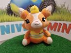Peluche à l'effigie de la mascotte KOMATSU représentant un renard Kitsumi habillé avec un baudrier et un casque de chantier jaunes. 16,00 x 14,50 x 18,50 cm.