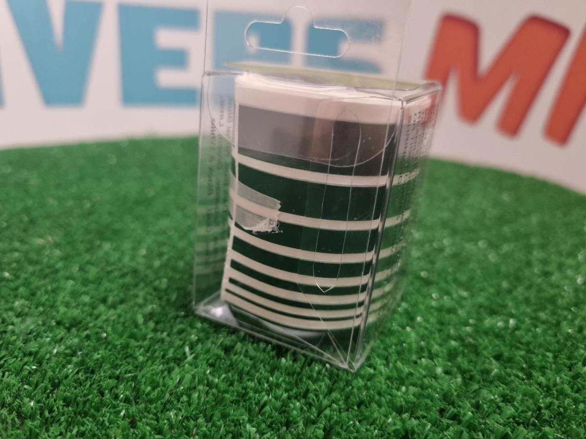 Filets de décoration autocollants vert. Faciles à utiliser, chaque boîte contient un assortiment de 8 largeurs différentes, 0,5 - 0,8 - 1,3 - 2,1 -3,3 - 5 - 7 et 10mm sur une longueur de 2,5 mètres. Ces filets résistent au carburant, ils peuvent être utilisés sur toutes surfaces lisses et même à l'intérieur des verrières ou carrosseries transparentes.