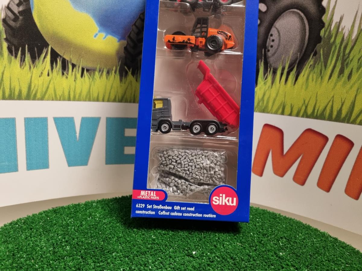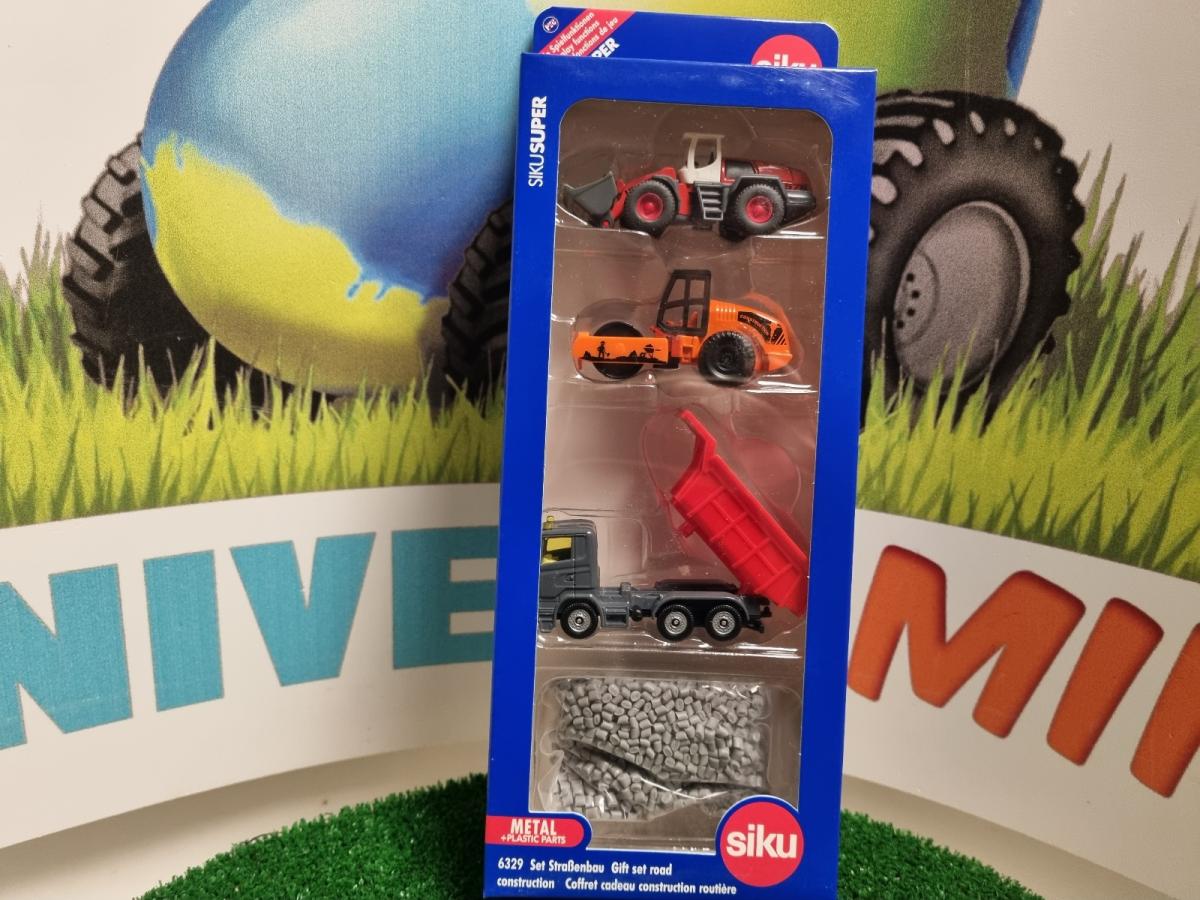 Coffret construction comprenant un camion benne, un chargeur, un rouleau compresseur et un sachet de faux cailloux.