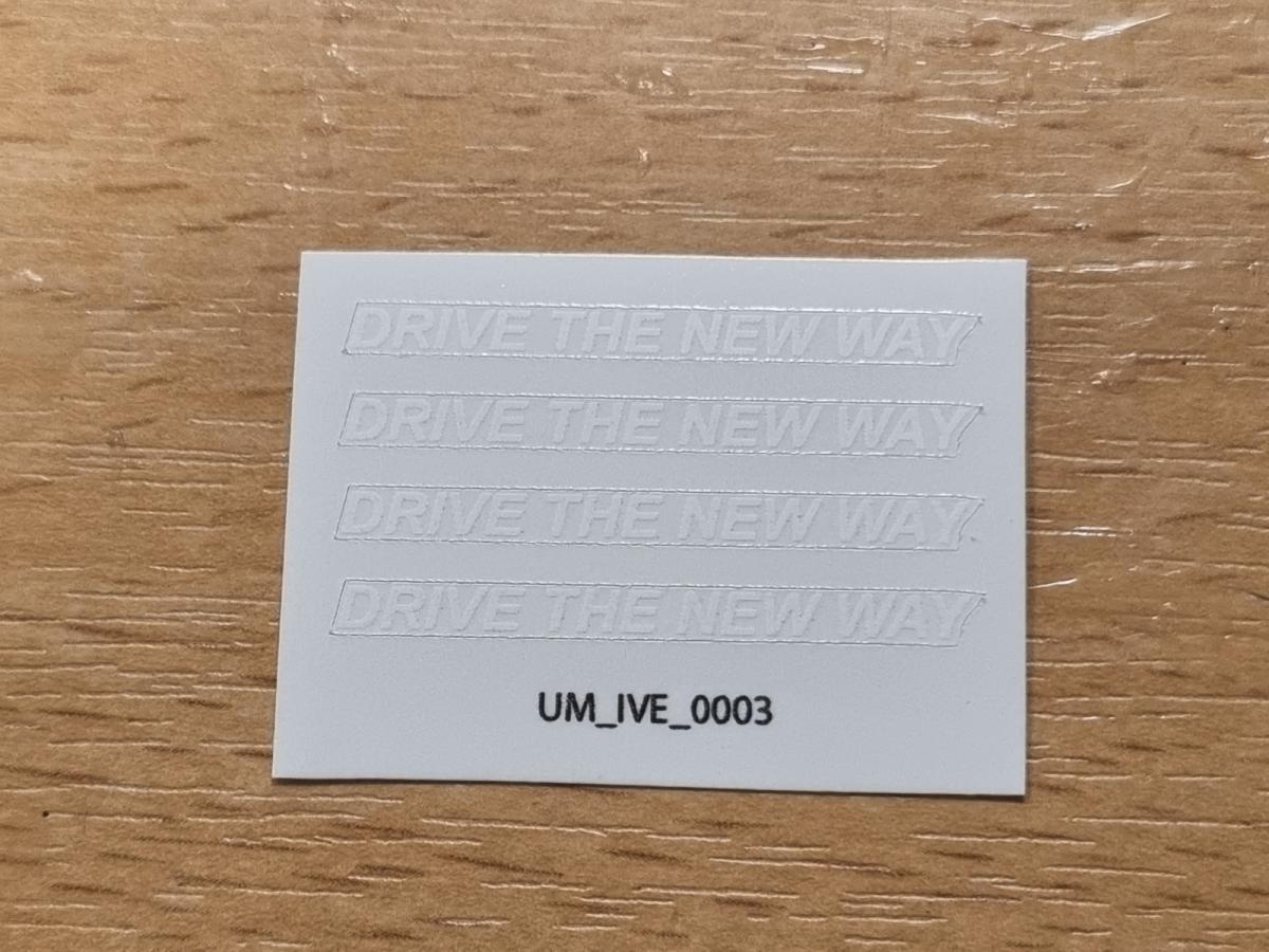 4 décalques IVECO texte Drive the new way blanc pré-coupé. 33x2.2mm. Fond transparent. Décalque à l'eau. Faites tremper le motif dont vous avez besoin 10/15 secondes dans de l'eau puis décoller le motif pré-coupé. Comment poser les décalques.