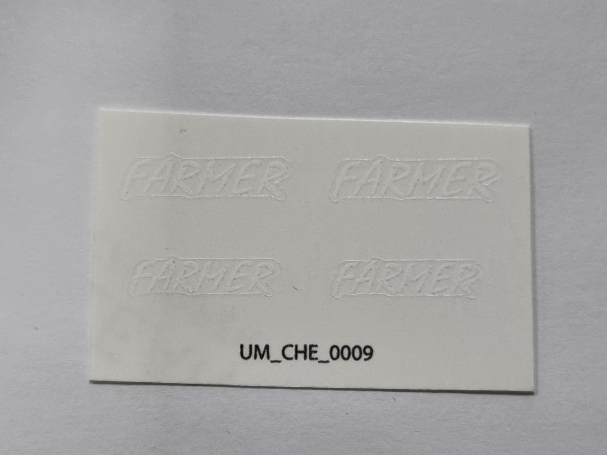 4 décalques logo CHEVANCE Farmer blanc pré-coupé. 2 décalques de 4x16.3mm et 2 décalques de 3.5x14.2mm. Fond transparent. Décalque à l'eau. Faites tremper le motif dont vous avez besoin 10/15 secondes dans de l'eau puis décoller le motif pré-coupé. Comment poser les décalques.