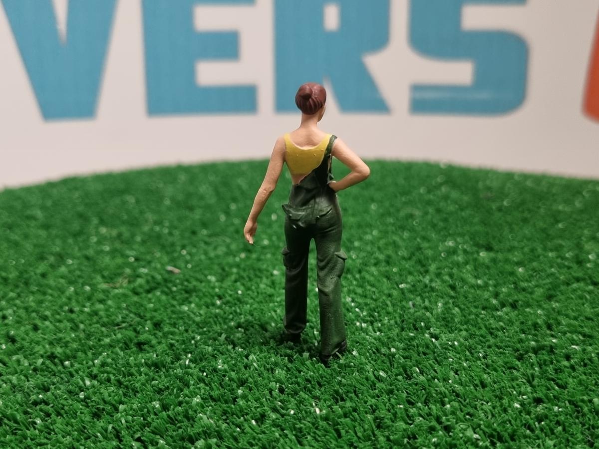 Femme mécanicienne combinaison ouverte vert/jaune. Figurine peinte à la main et livrée dans une boite de protection. Livrée avec pastille adhésive pour maintenir le personnage debout. Le coloris peut varier selon l'arrivage.