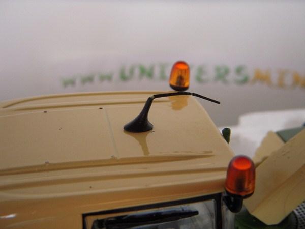 La vitre de la cabine est fendue et une antenne est cassée.