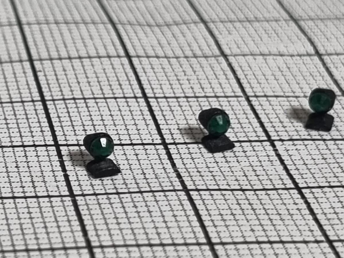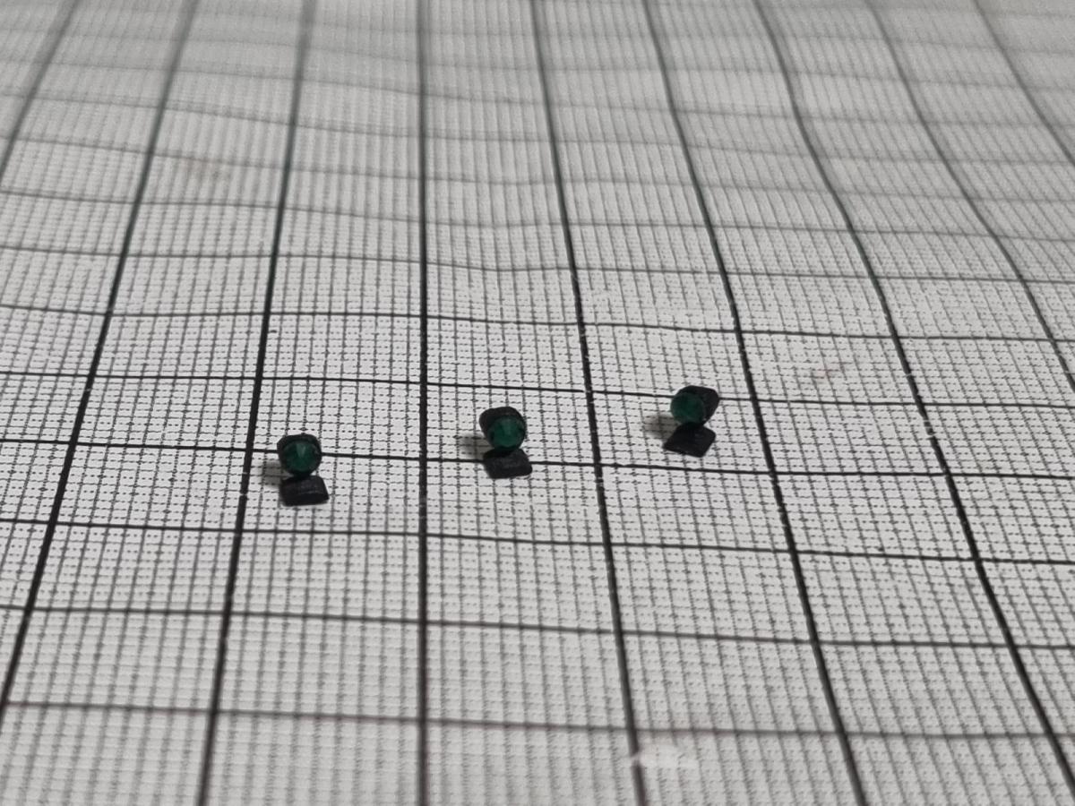 3 feux vert avec pied pour cabine. Les pieds sont imprimés en 3D. Il est possible qu'un léger ponçage sous le pied soit nécessaire pour qu'il soit parfaitement plat.