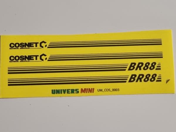 4 autocollants COSNET BR88 jaune pré-coupé. 2 autocollants pour chaque côté pouvant être recoupé au niveau des bandes noires selon la longueur désirée. Hauteur 5.4mm. Longueur environ 91mm.