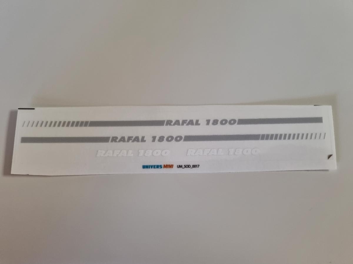 Autocollants SODIMAC Rafal 1800 gris pré-coupé. 2 bandes latérales 168x3.5mm. 2 autocollants RAFAL 1800 3.5x40mm. Fond transparent.