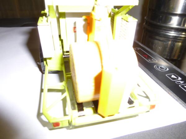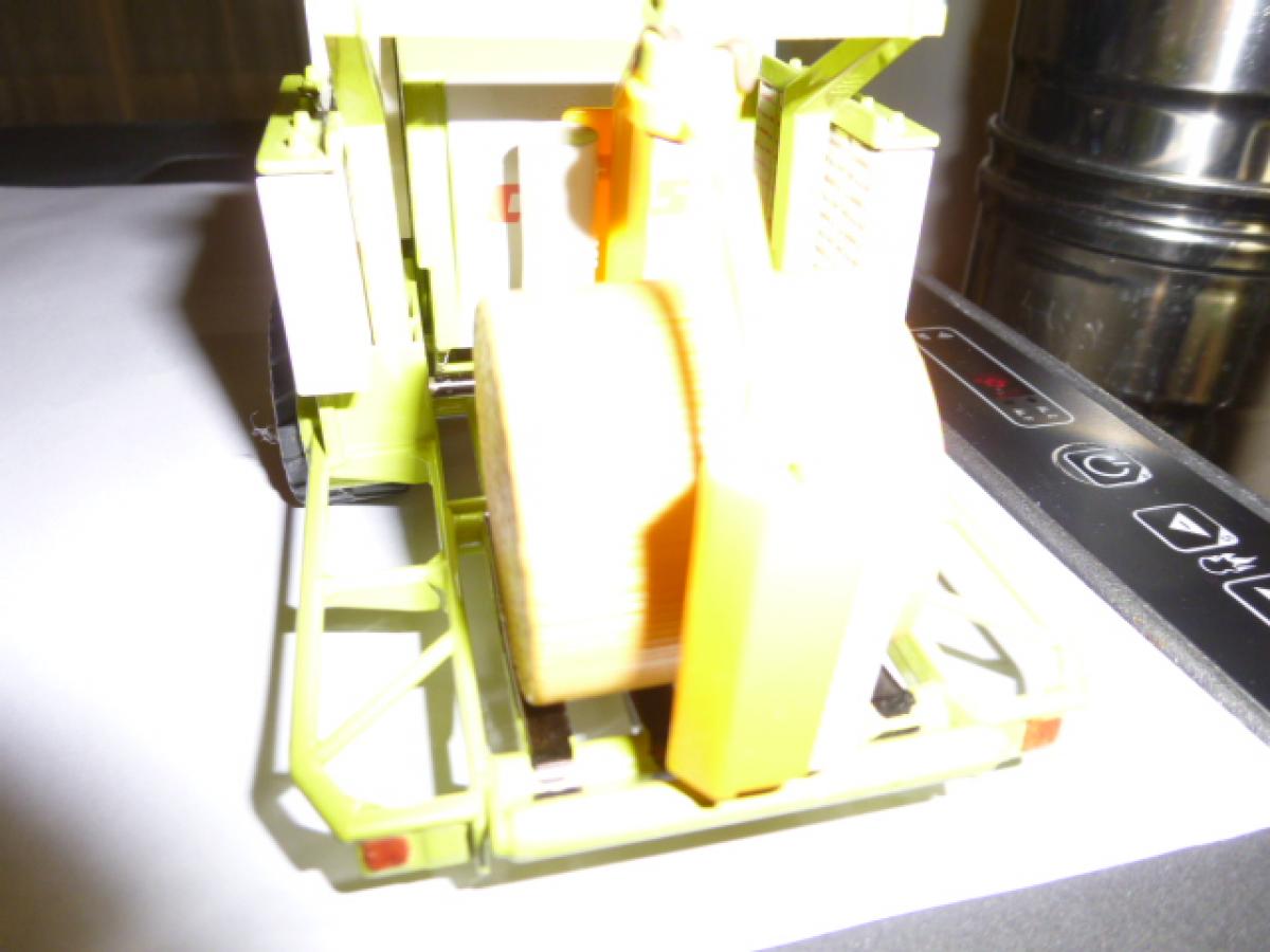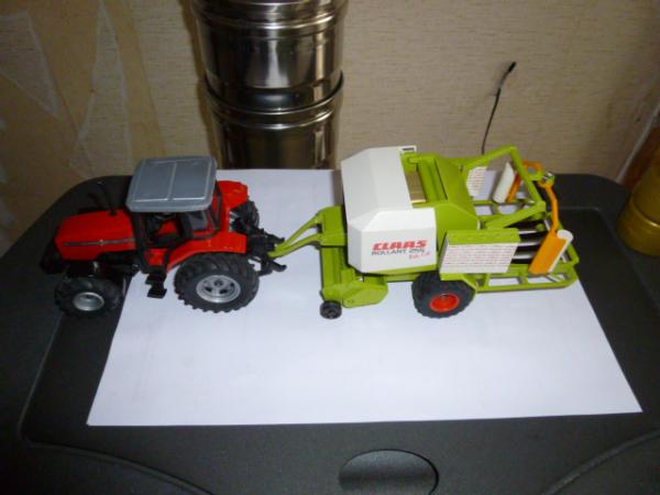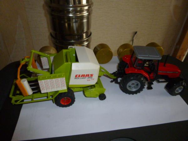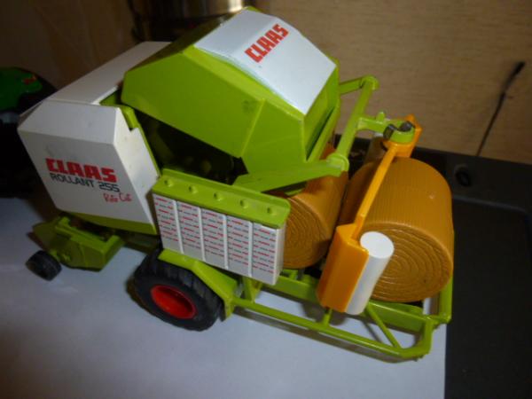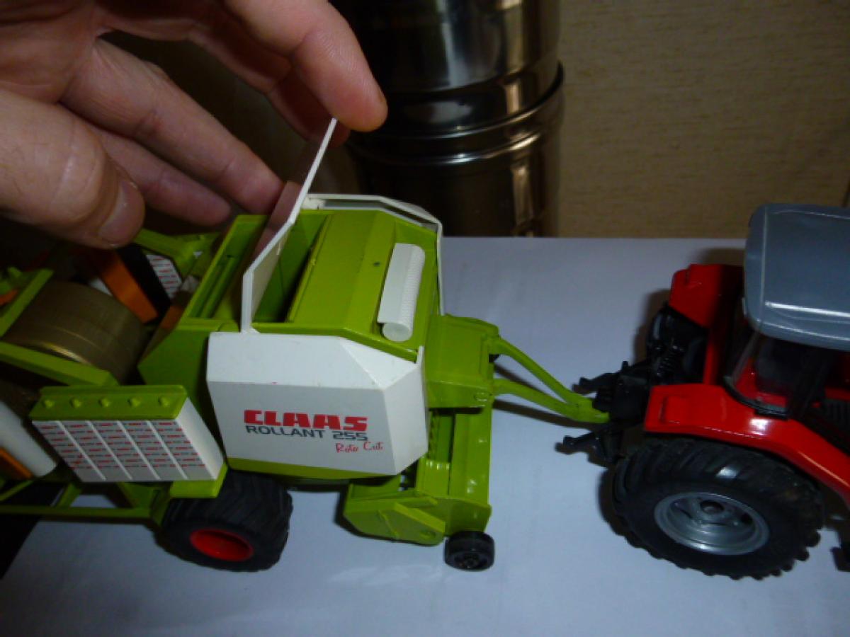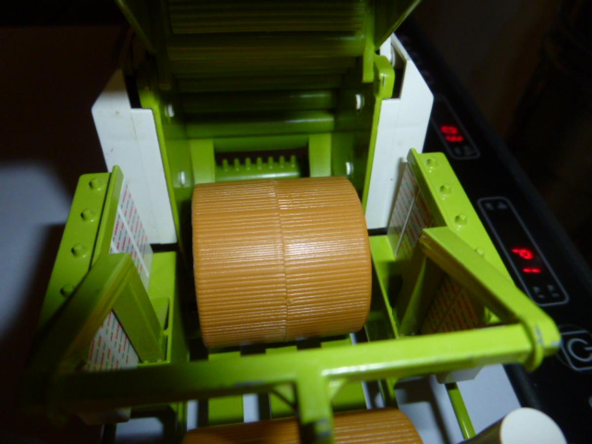belle presse à balle ronde avec erubanneuse intégrée, solide, idéale pour les enfants, un peu de personnalisation, 4 courroies teinte en noire comme la version échelle 1, porte de presse ouvrante et chambre de presse compatible avec les balles ronde UH du plateau vanto - 5 balles rondes couleur paille siku et 20 balles rondes couleur paille UH offertes