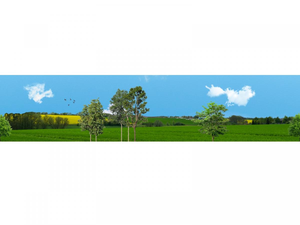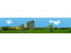 Poster de fond paysage printemps/été type D. 40cmx180cm. Avec arbres en 1er plan. Tous les poster POS01 ont la même couleur de ciel, ils peuvent être combinés entre eux. Le poster est envoyé dans un tube cartonné.