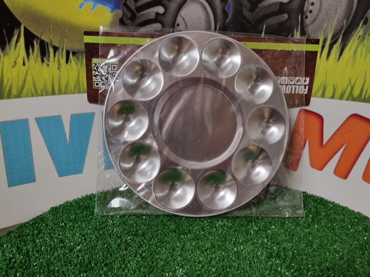 Palette ronde métal pour travaux de peinture et de modélisation. Fait d'aluminium robuste estampé de 10 puits. Léger et facile à nettoyer. Résistant aux solvants synthétiques et acryliques, ainsi qu'à l'acétone, au white spirit et au mastic.