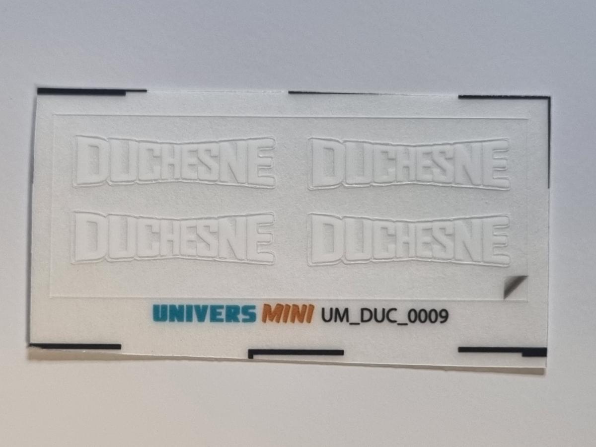 4 autocollants logo DUCHESNE blanc. 5x21mm. Pré-coupés, décollez et collez comme un autocollant classique ou utilisez la méthode décalque.