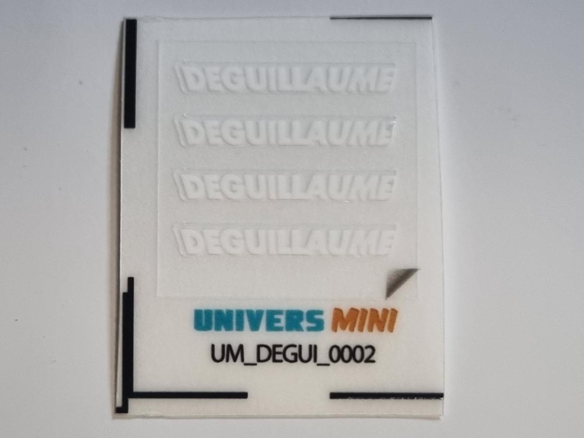 4 autocollants logo DEGUILLAUME blanc. 2x18mm. Pré-coupés, décollez et collez comme un autocollant classique ou utilisez la méthode décalque.