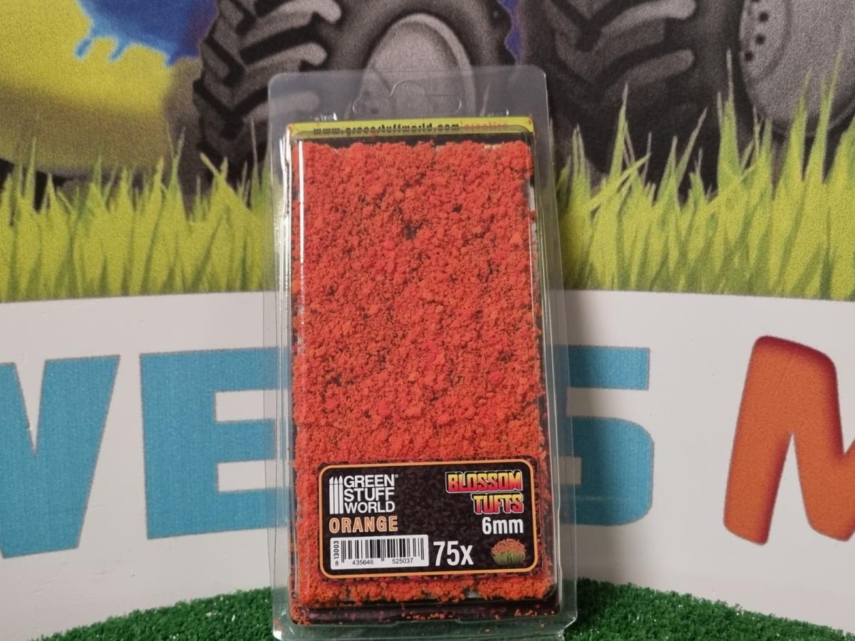 75 touffes de fleurs orange. Hauteur 6mm. Prêt à l'emploi en décollant simplement chaque touffe individuellement et en la plaçant dans votre scène.