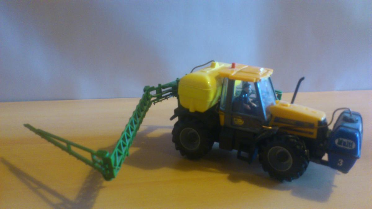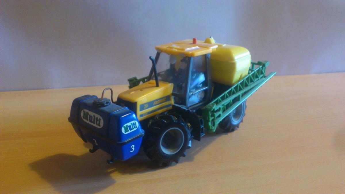 Model ancien, artisanal, fabriqué avec un pulvé traîné Britains, vert et jaune sans Marque défini. A l'avant, un pulvé porté sans Marque, le tous est collé, relié avec un fil en cuivre pour le transfère de la cuve avant a celui de l’arrière. Attelage arrière condamné. Etat correct.