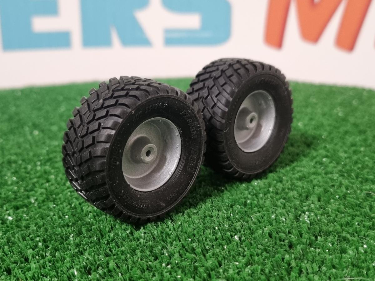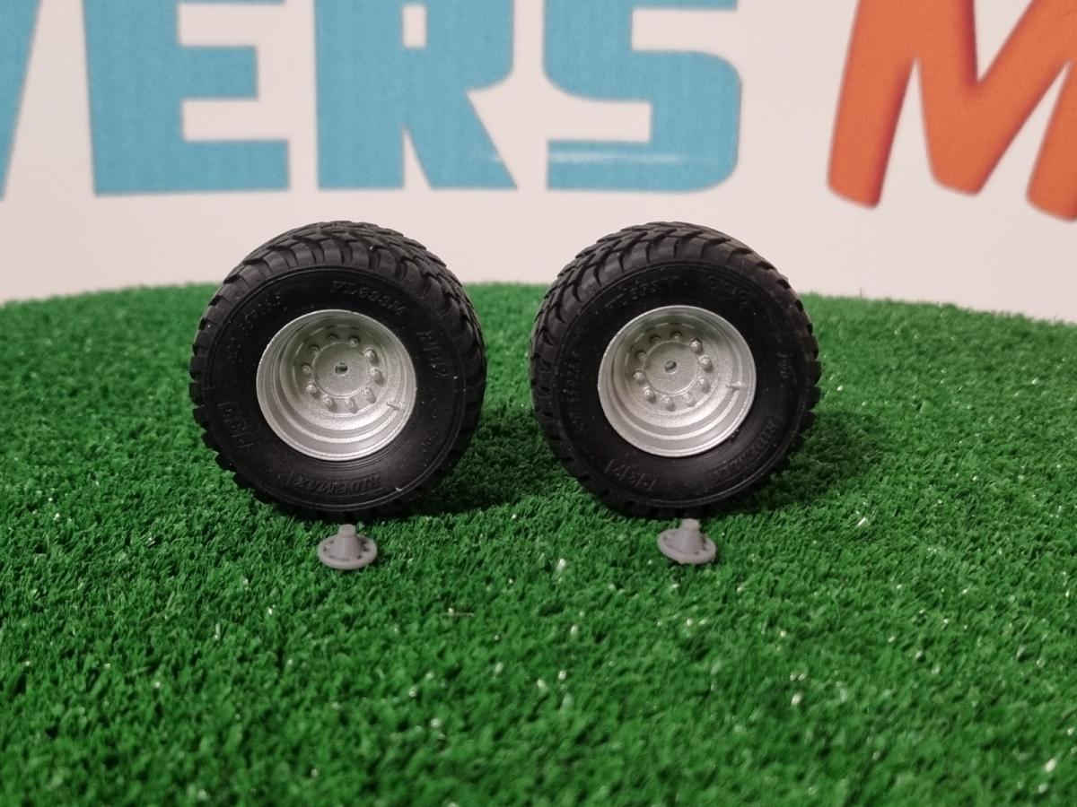 2 jantes gris aluminium avec pneus 600/55 R26.5. Diamètre 42mm. Largeur 19.8mm. Trou axe 2mm (à repercer selon vos besoins). Le cache moyeu est livré non peint.