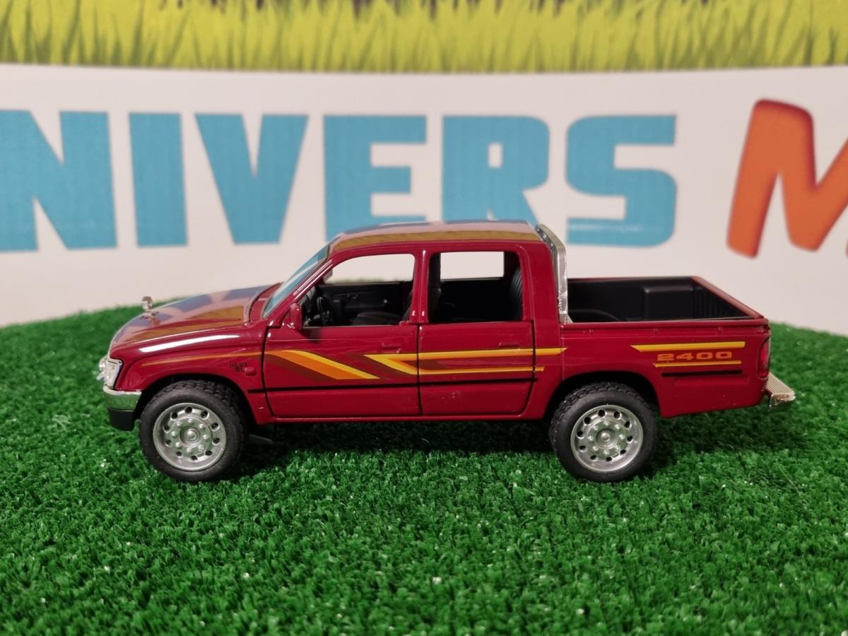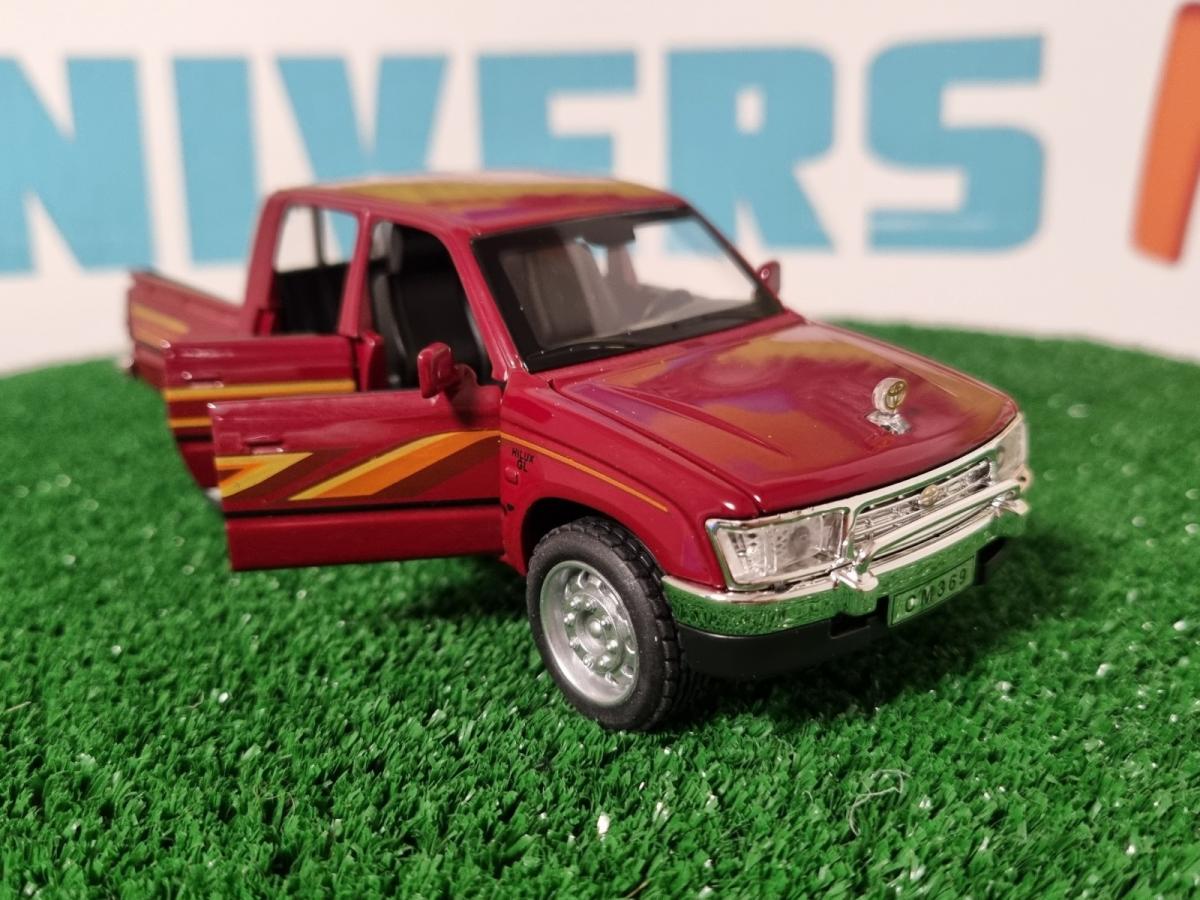 Pickup TOYOTA Hilux rouge des années 90. Portes, capot et coffre s'ouvrent. Son et lumière. Longueur 15.5cm.
