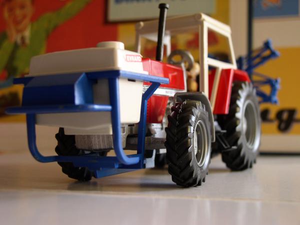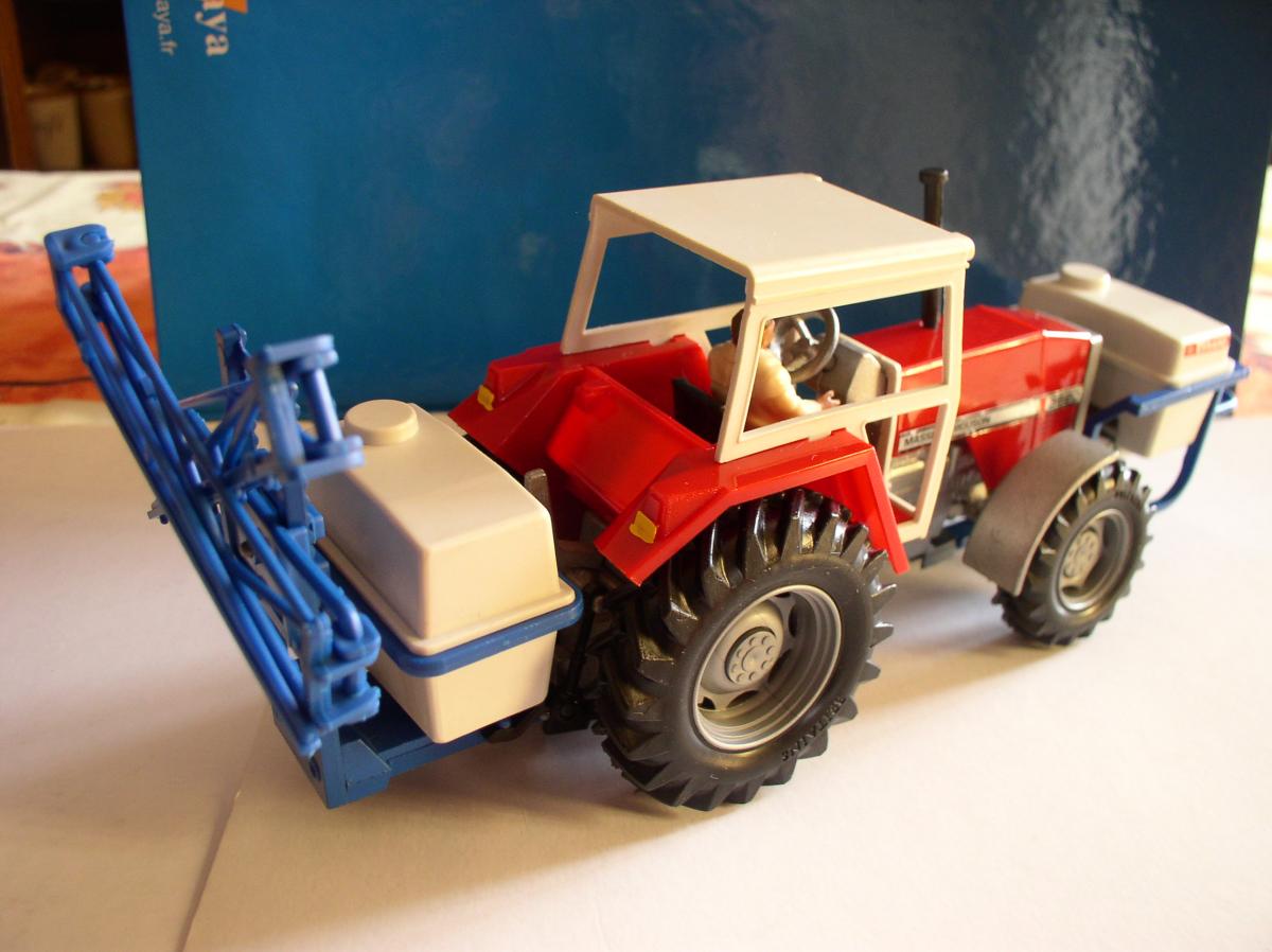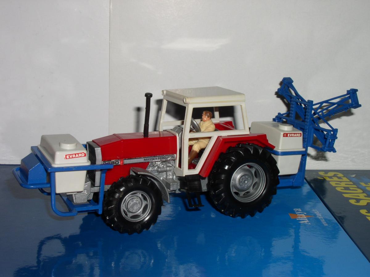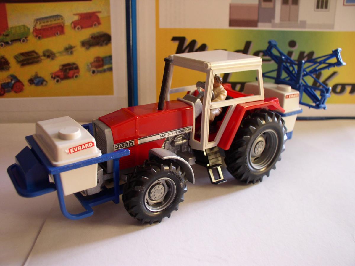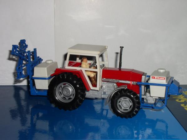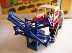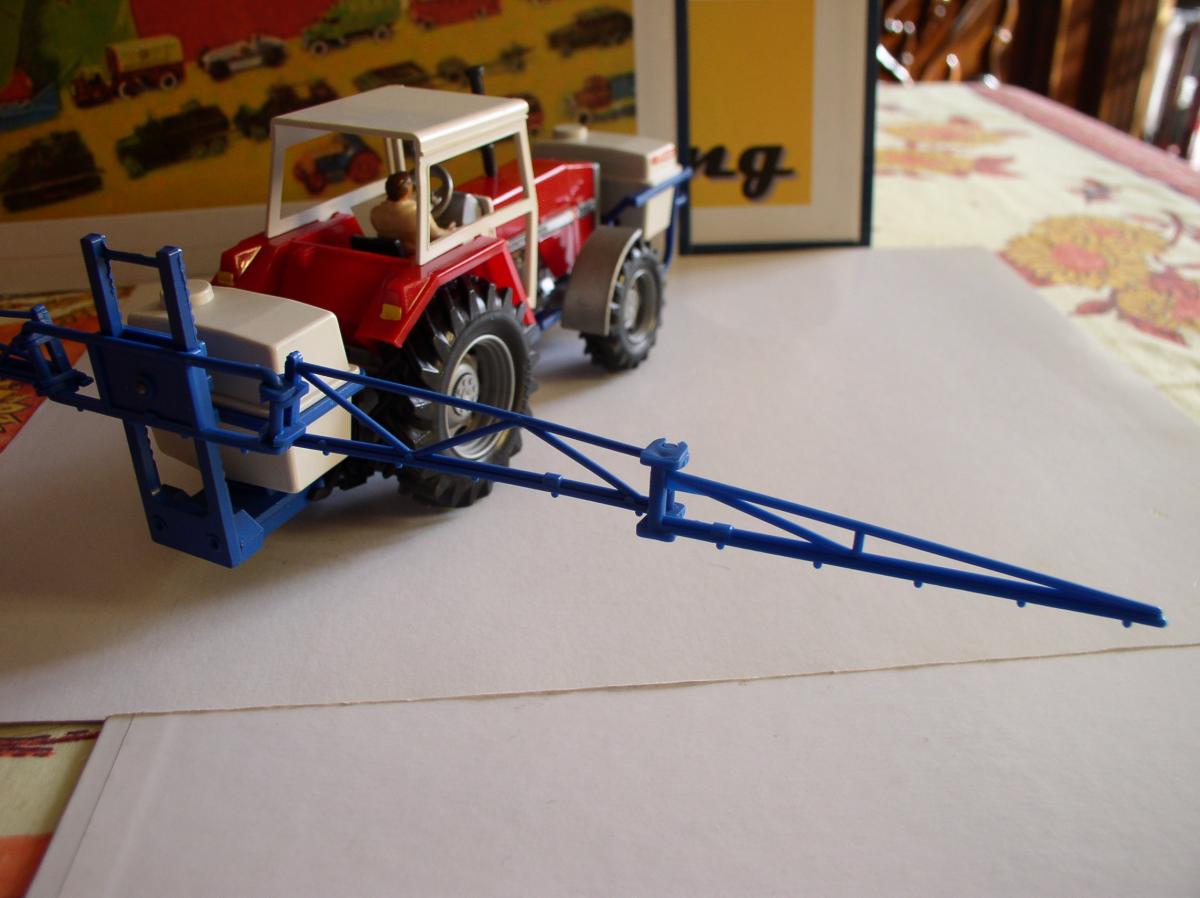Le pulvérisateur à l'arrière se fixe sur le relevage de manière classique chez Britains. Le bloc de pulvérisation est réglable en hauteur sur le bâti et les rampes se déplient de chaque côté en 2 parties. Décalcomanies d'origine.