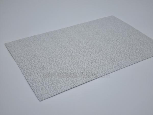 1 plaque styrène imitation mur en pierre. 200x300x0.75mm. La taille des briques est variable mais la plus grande mesure 4x9mm et la plus petite 1x4mm. Se coupe très facilement à l'aide de ciseaux.
