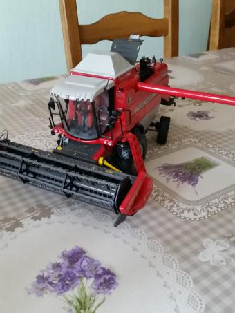 Moissonneuse Massey Ferguson Activa 7245 de marque Universal Hobbies H2662 en excellent état avec ajout d'un conducteur et panneau convoi agricole