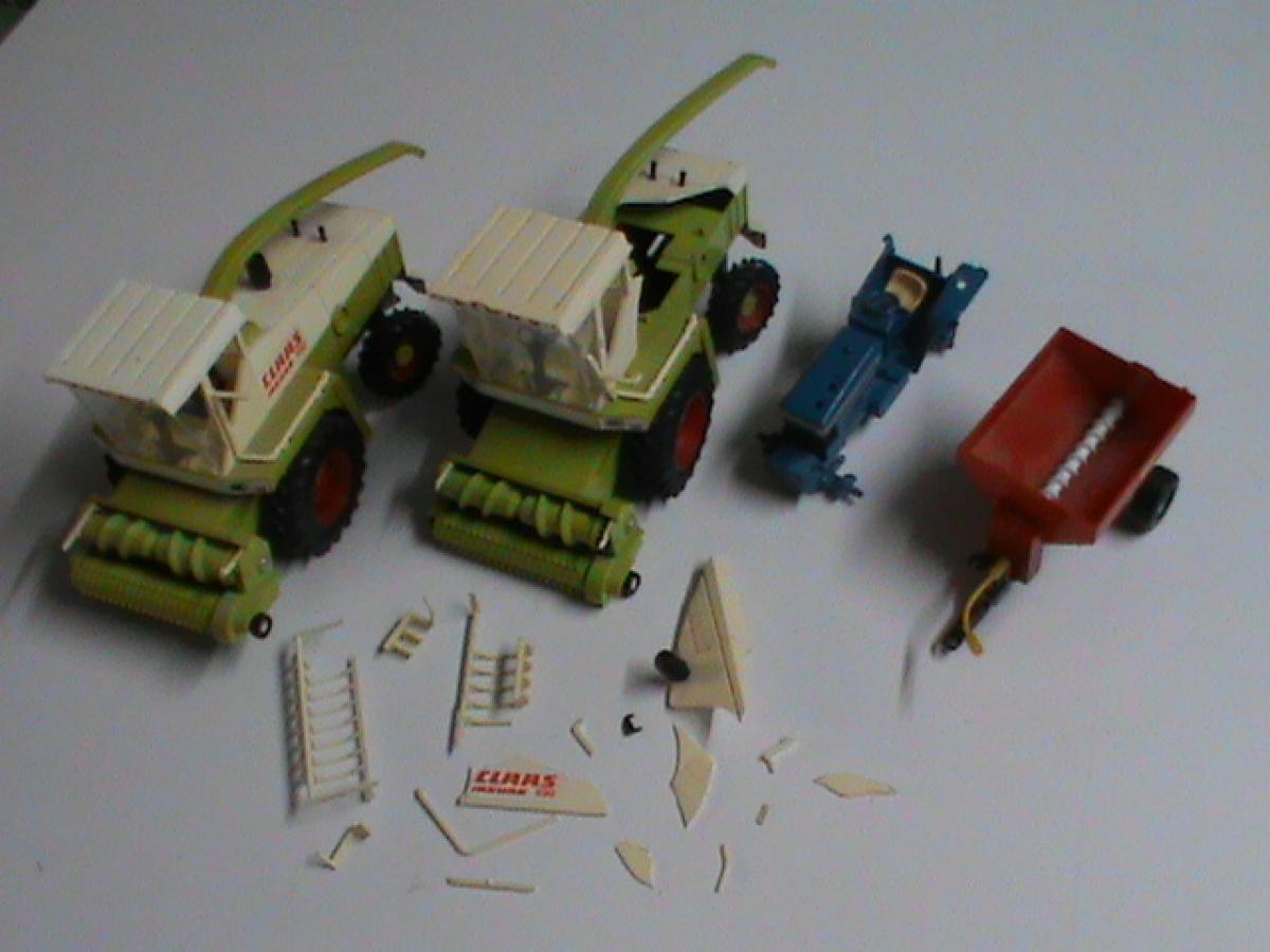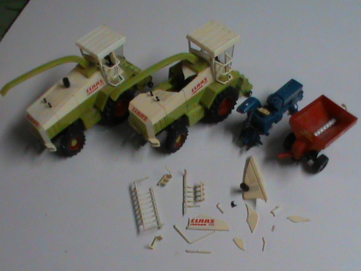 Lot de 2 ensileuses Britains CLAAS Jaguar 690 dont 1 "sauvable", 1 épandeur Powerfarm, pion d'entrainement entre essieu et goulotte AR cassé, et Ford TW 20