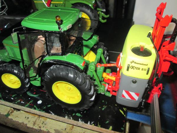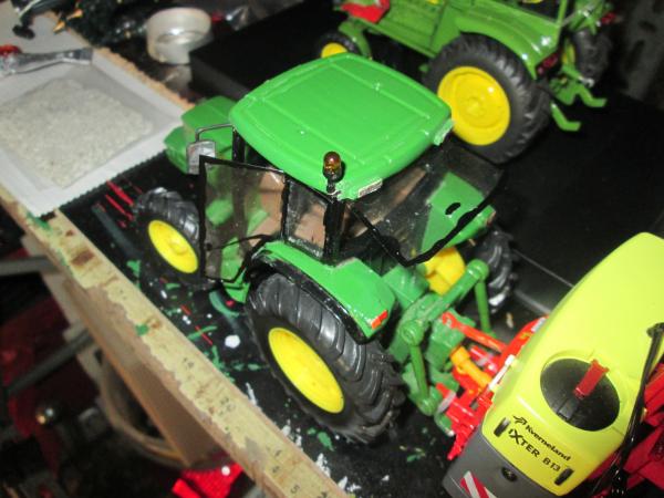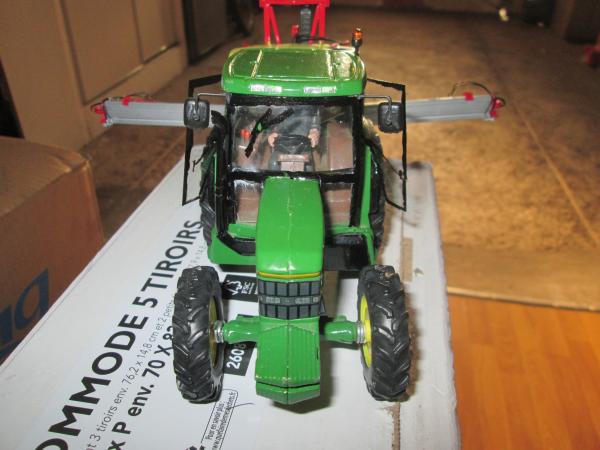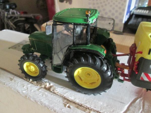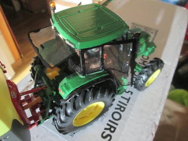 remplacé les roues par celle du JD 3650 de britains,les roues avant tourne pas seule il faut les tourner avec la main ,ajout d'un gyrophare,de phare de travail sur le haut de la cabine ,clignotant vitres portes et vitre arrière en position ouverte