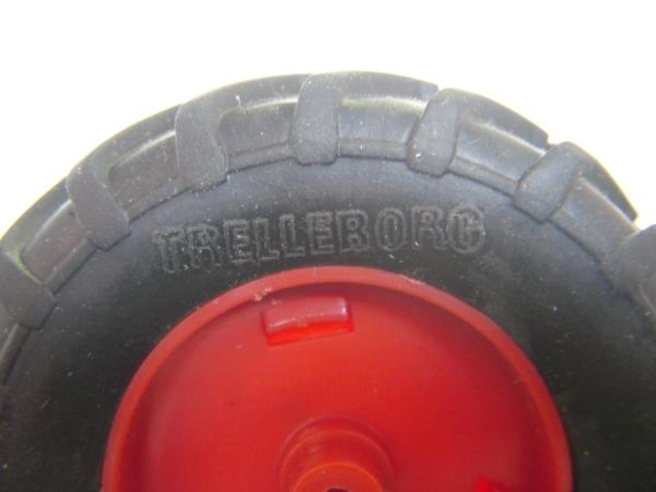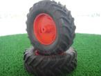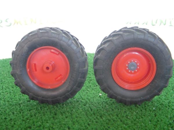 2 pneus arrière + jantes pour tracteur FENDT 828 du fabricant Wiking. Référence 7307. Diamètre : 6.5 cm. Largeur : 2.2 cm.