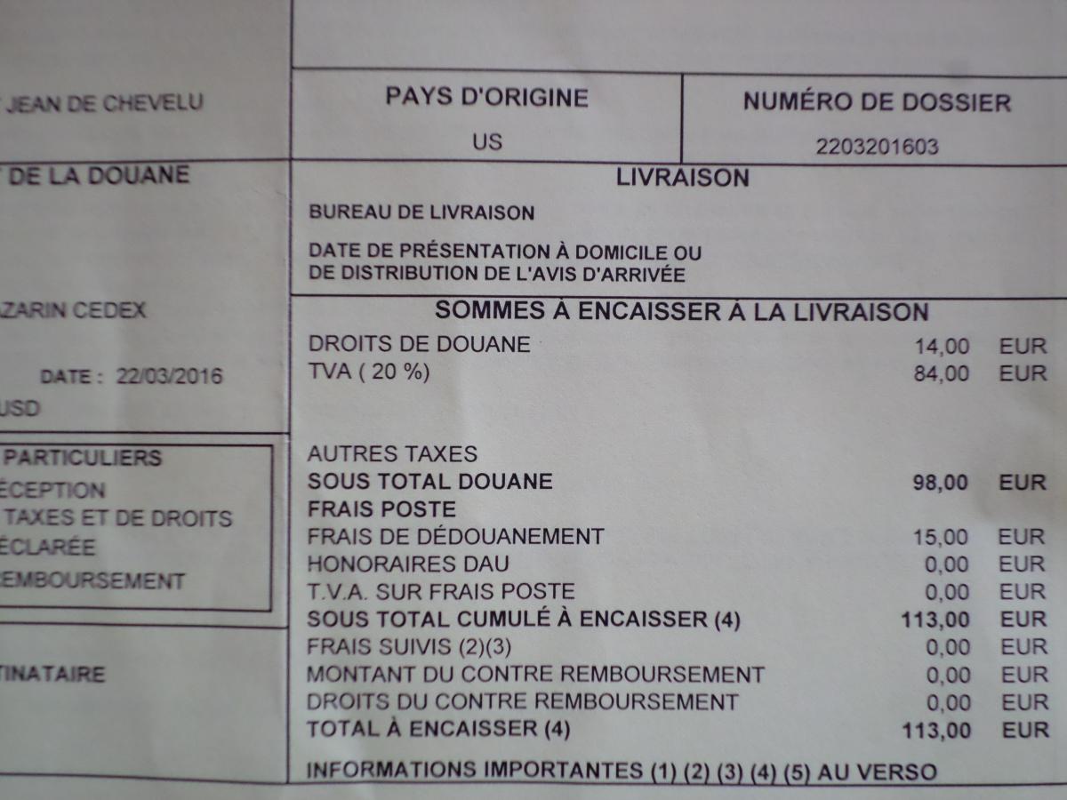 - Frais de douane : 56,50 euros