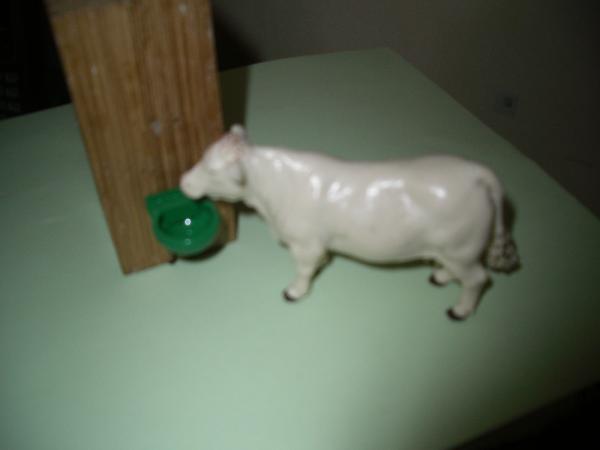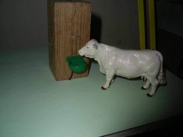 2 abreuvoirs a niveaux constants avec fil imitation tuyau .le support en bois est la vache ne fait pas parti de la vente.possible dans faire plus sur demande.