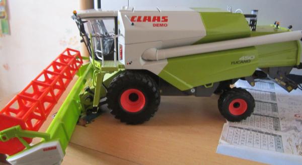 Claas tucano 450 en bon état quelques petite traces de colle en divers endroit, mais rien de grave ,rajout d'un panneau convoi agricole ,nouveaux gyros ,vendue avec la coupe de la Lexion 580 norscott, manque la roue jockey sur le chariot et (boite abimer) ,sinon ras .
