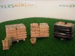 Ensemble de sacs de pomme de terre comprenant : sacs empilés, sacs empilés incomplets, sacs empilés filmés, 3 sacs individuels et 1 sac ouvert.