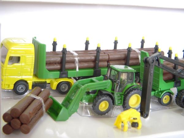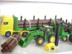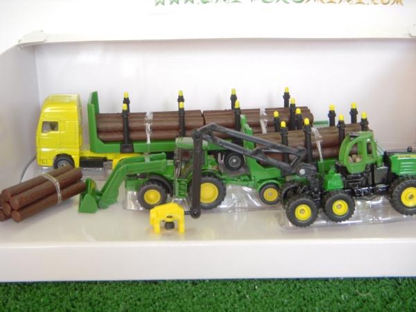 Coffret forestier JOHN DEERE composé d'une abatteuse JOHN DEERE, d'un tracteur JOHN DEERE + fourche avec remorque forestière, d'un camion MAN avec remorque forestière et de troncs de bois.