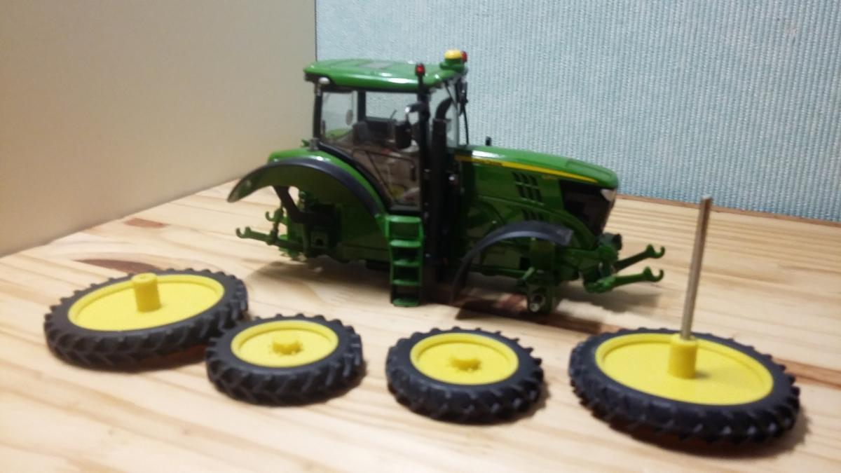 Les roues arrières tiennent sur un axe et les roues avants tiennent également sur un axe, mais ont tendances à se déboiter si on fait rouler le tracteur.