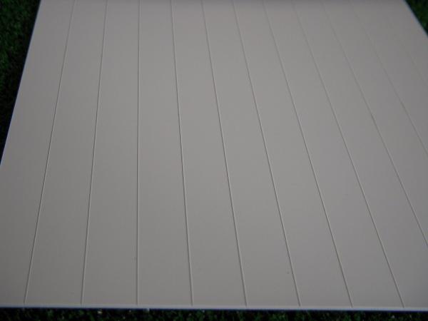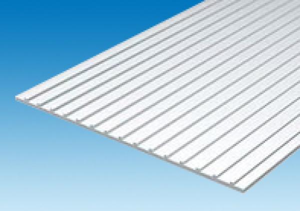 1 plaque de toit styrène banc. Plaque rainurée vendue avec des lamelles type toiture. Longueur: 300mm Largeur: 150mm. Épaisseur: 1mm. Écartement entre les lamelles de centre à centre: 12.7mm.