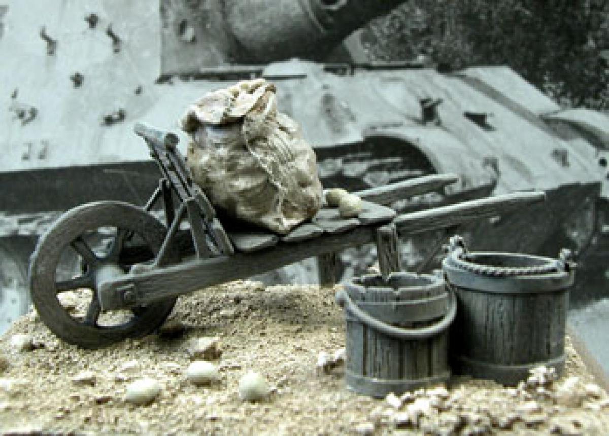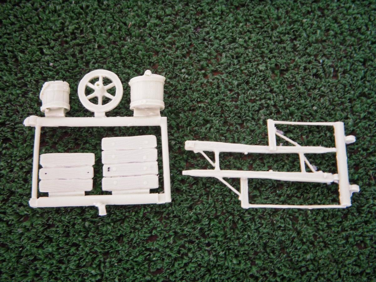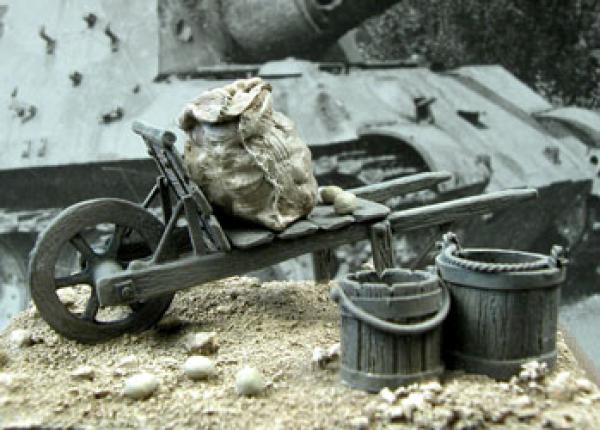 1 brouette. A monter, 7 pièces. Échelle 1/35ème mais convient parfaitement au 1/32ème.