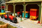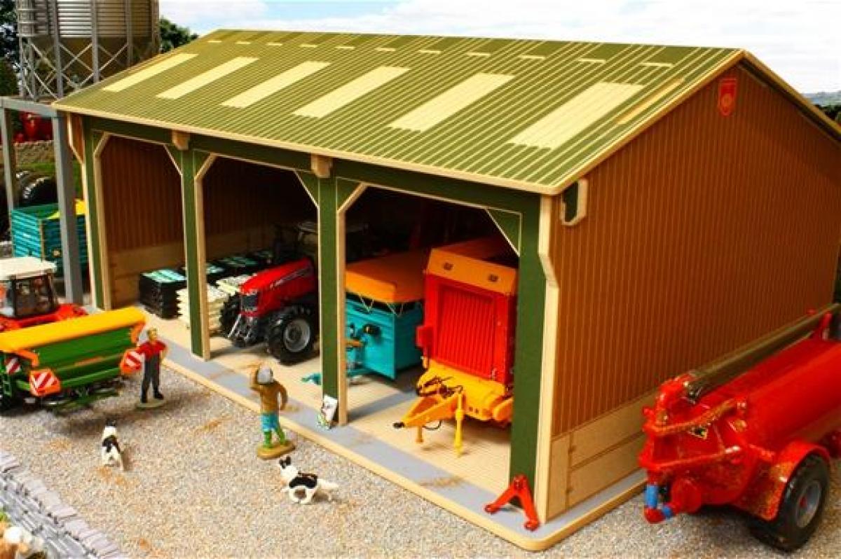 Hangar 3 travées . Nombreux détails. Longueur 560 mm Largeur 400mm Hauteur 260mm. Animaux et matériels agricoles vendus séparément.