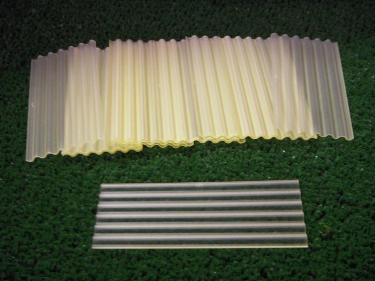 15 tôles ondulées jaune transparentes. Dimensions d'une tôle 78.16mm x 34.2mm.
